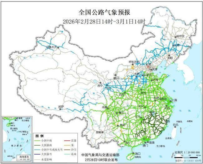 全国公路气象预报图(2月28日14时至3月1日14时)