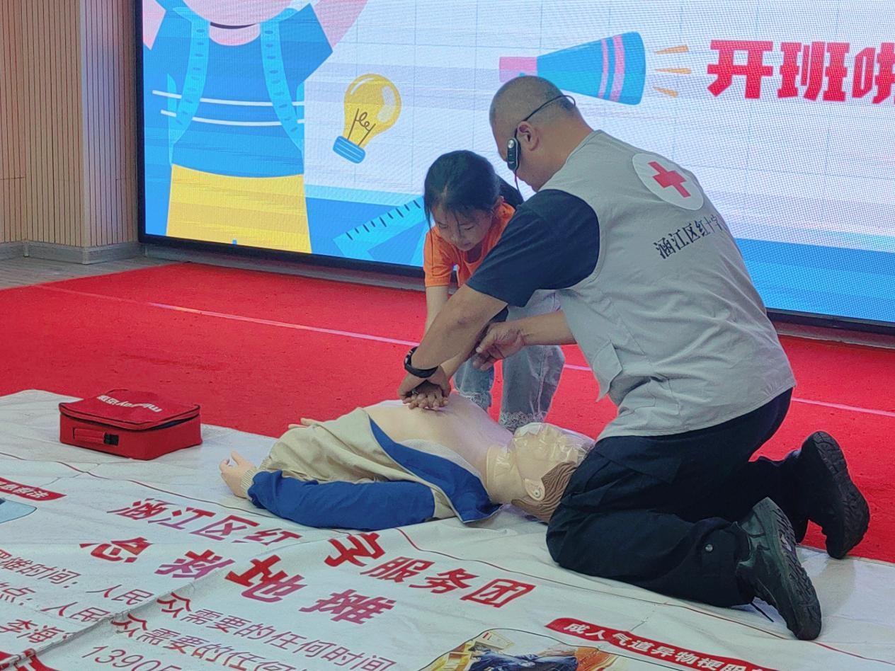 在铺尾社区服务点,安全教育同样精彩纷呈。中国好人、红十字金盾志愿服务队队长李海东手把手教孩子们心肺复苏急救技能,民警志愿者则通过仿真毒品模型展示与互动游戏,为孩子们带来生动的毒品安全教育课。“原来彩色糖果和饮料瓶也可能是毒品伪装的!”小学生小林指着展台上的模型分享新知。这些来自专业救援与警务力量的沉浸式安全课,将急救技能与防毒知识深植童心,也让暑托班安全教育更显立体。